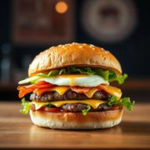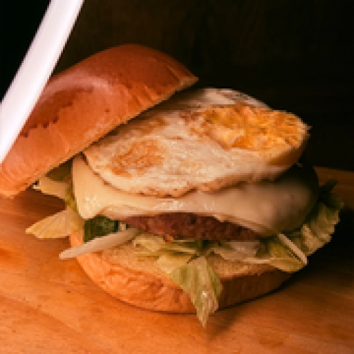 Bacon, carne, molho, ovo, pão, queijo, salada